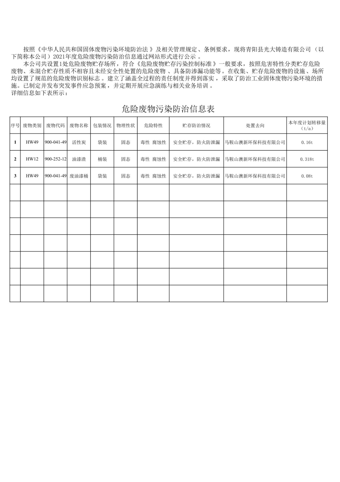 2021年度危險(xiǎn)廢物污染防治信息公示